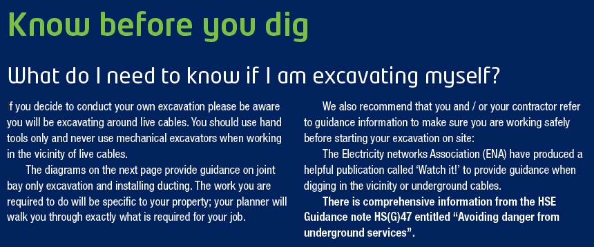 If you decide to conduct your own excavation, please be aware you will be excavating around live cables. You should use hand tools only and never use mechanical excavators when working near live cables.